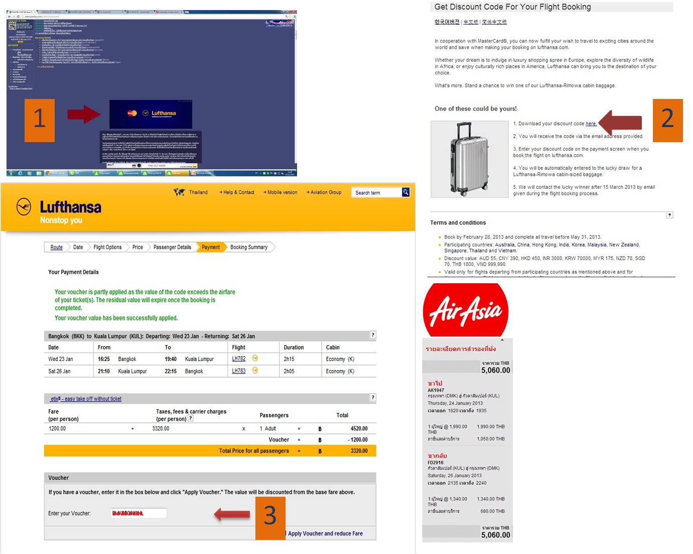 1. กด link Lufthansa จากห้อง Blue planet 2. กด link เข้าสู่หน้าลงทะเบียน หลังจากลงทะเบียนเสร็จจะได้รับ รหัส Voucher ทาง Email 3.นำ รหัส Voucher ไปใส่ในหน้า Booking ของ lufhansa และกด apply voucher and reduce fare