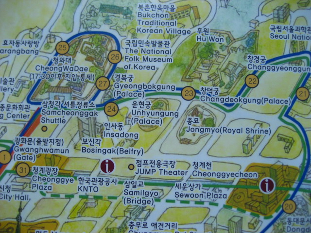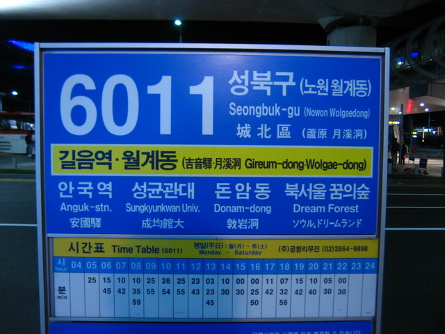 รถเมล์ก็มีอยู่หลายสายมากมายครับ เดินออกจากส่วน Arrival Hall ก็จะเห็นป้ายรถเมล์เรียงรายอยู่เลยครับ แต่ละสายวิ่งไปไม่เหมือนกันครับ ตัวอย่างเช่น สาย 6002 ผ่านสถานี Jong-no3 ซึ่งมีที่พักสไตล์ backpacker ก็หลายแห่ง แต่ถ้าใครจะพัก Banana หรือเกสเฮาส์สไตล์บ้านเกาหลีเก่าๆ ก็ต้องนั่งสายที่ผ่านสถานีรถไฟฟ้า Anguk Station นั่นก็คือสาย 6011 ครับ