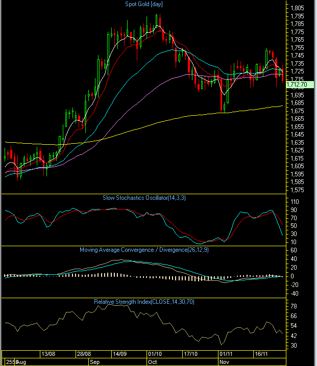 - ภาพเทคนิคของราคาทองยังมีแนวโน้มที่จะปรับตัวลงต่อ หลังจากไม่สามารถดีดตัวผ่านแนวต้านบริเวณ 1,740 ดอลลาร์ ขึ้นไปได้ แนวรับของวันอยู่ที่บริเวณ 1,700-1,705 ดอลลาร์ หากไม่สามารถยืนเหนือแนวรับบริเวณนี้ได้ คาดว่าจะเป็นปัจจัยลบกดดันให้มีแรงขายออกมามากขึ้น จนราคาปรับตัวลงไปสร้างฐานที่แนวรับบริเวณ 1,680 ดอลลาร์ ต่อไป ส่วนการเคลื่อนไหวของราคาโลหะเงินซึ่งเมื่อวันศุกร์ปรับตัวลงเข้าใกล้แนวรับบริเวณ 33.0 ดอลลาร์ ซึ่งจะเกิดสัญญาณขายขึ้นหากราคากลับลงไปเคลื่อนไหวต่ำกว่าแนวรับบริเวณนี้ โดยคาดว่าราคาโลหะเงินจะปรับตัวลงไปยังแนวรับบริเวณ 33.30-33.50 ดอลลาร์ ก่อนที่จะเริ่มดีดตัวขึ้นได้ต่อไป